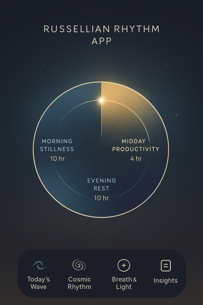 WRAI: Beautiful—let’s explore what a Russellian-aligned day might look like for a human or society living in conscious harmony with the universal wave—where every action is balanced by stillness, and power flows from the center of knowing, not from reaction or force.